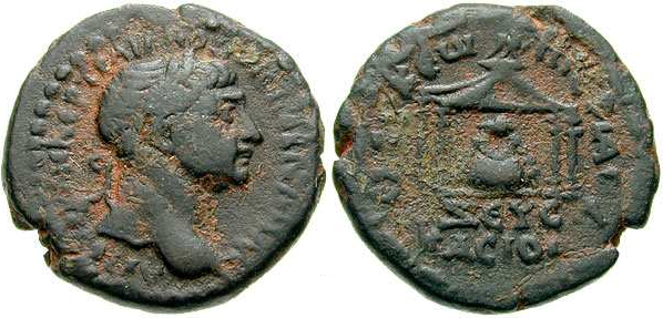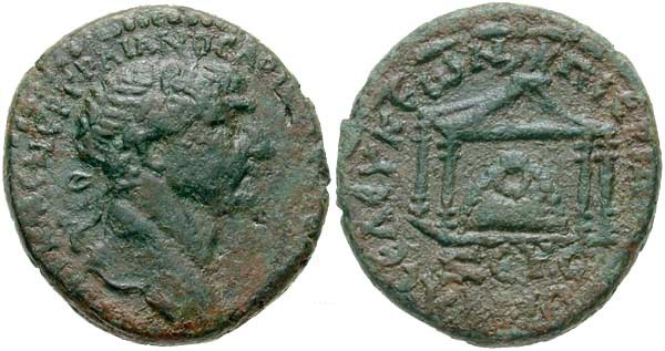 La moneta cosi’ e’ descritta e classificata : Traiano AE (bronzo) di 20 mm. , emessa a Seleukia Pieria in Siria , legenda in Greco al dritto : AYTOKΡ KAIC NEΡ TΡAIANOC AΡICT ΓEΡM ΔAK , capo laureato rivolto a destra , la legenda al rovescio in Greco : CEΛEVKEΩN ΠEIEΡIAC , in esergo ZEYC KACIOC , dentro il Tempio l’ immagine della pietra sacra di Zeus Kasios . SNGCop 403 .