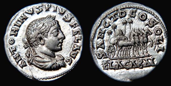 La legenda del rovescio che gira intorno al carro trionfale dice : SANCT DEO SOLI e in esergo ELAGABAL .