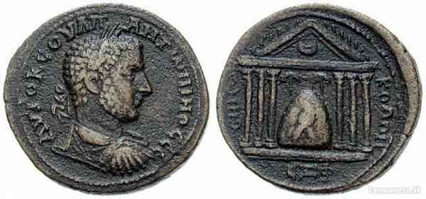 Uranio Antoninus AE (bronzo) 32 mm. di Emesa , Seleucia , Siria , anno 253 – 254 , legenda al dritto : AVTOK COV – ANT’NINOC CE , capo laureato , drappeggiato e corazzato con busto a destra ; legenda al rovescio : EMIC, KO , tempio esastilo contenente la pietra conica di Elagabal , ornato con un’ aquila di fronte , ombreggiato da due ombrelloni ; frontone ornato di mezzaluna ; EXF nell’ esergo . SGI 4414 .