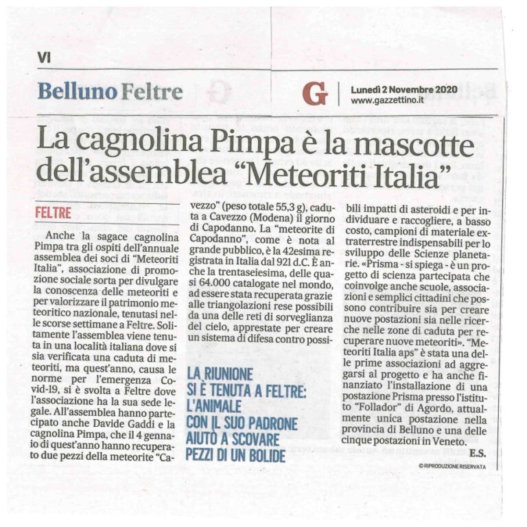 PIMPA è la cagnetta che ha trovato il primo frammento della meteorite CAVEZZO e, avendo partecipato con il suo accompagnatore Davide Gaddi ad alcuni eventi organizzati da Meteoriti Italia APS, è conosciuta da molti dei nostri soci.